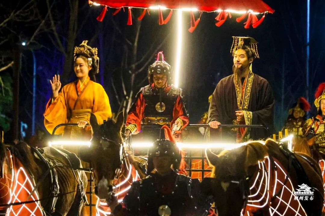 当日19时,“楚王巡游”率先“起驾”。与首演不同,此次巡游路线将围绕楚鼎广场行进半圈,让更多游客近距离感受车马仪仗的威严盛景。