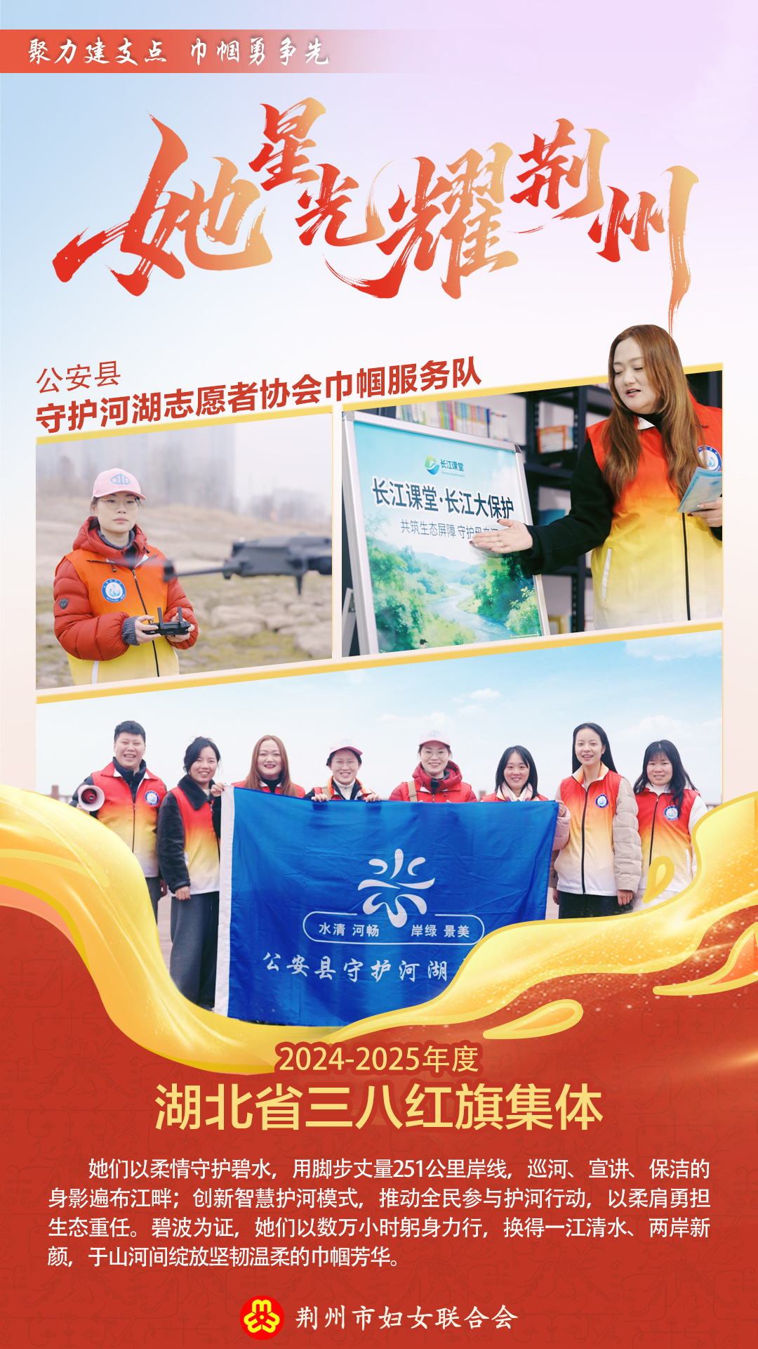 长江大学援藏工作队,荆州区西城街道三义街社区居民委员会“六邻服务”妇女小组,沙市区中山街道健康巷社区“578”志愿服务先锋队,江陵融媒巾帼电商助农团队,公安县守护河湖志愿者协会巾帼服务队荣获“湖北省三八红旗集体”称号。