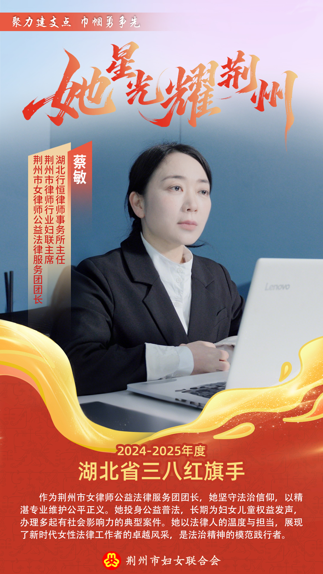 作为行业妇联主席,蔡敏致力于凝聚女律师力量,服务社会,先后荣获荆州市三八红旗手、湖北省律师行业“突出贡献提名奖”。在她看来,法治的微光能照亮未来,而她愿做那位坚定的点灯人与护航者。
