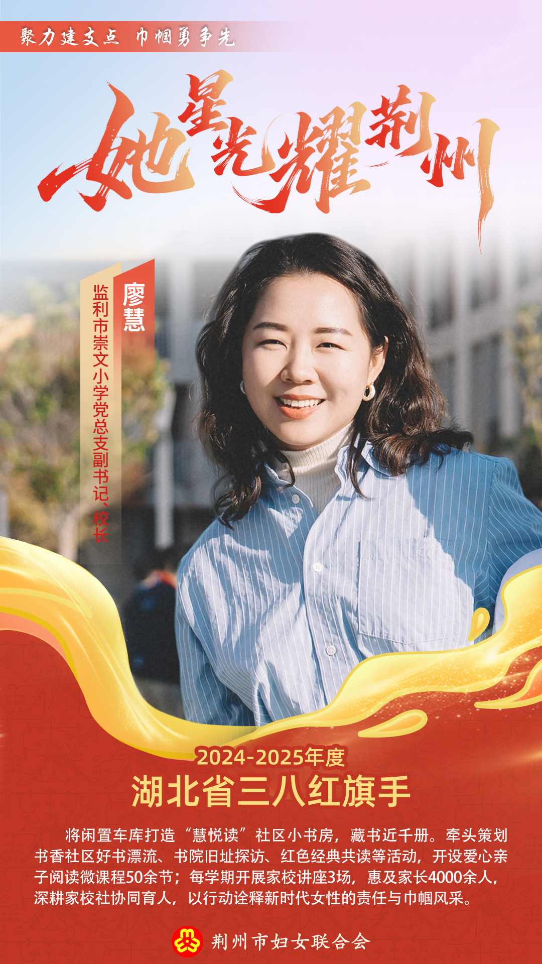 其中,荆州市城管执法委政策法规科科长、城管行业妇联主席王艳,松滋市村播妇联主席梅莉莉,监利市崇文小学党总支副书记、校长廖慧,湖北行恒律师事务所主任、荆州市律师行业妇联主席、荆州市女律师公益法律服务团团长蔡敏,石首市大垸镇四岭子村村委会委员、妇联主席卢冬梅,湖北省引江济汉工程管理局荆州分局科员王萍荣获“湖北省三八红旗手”称号。
