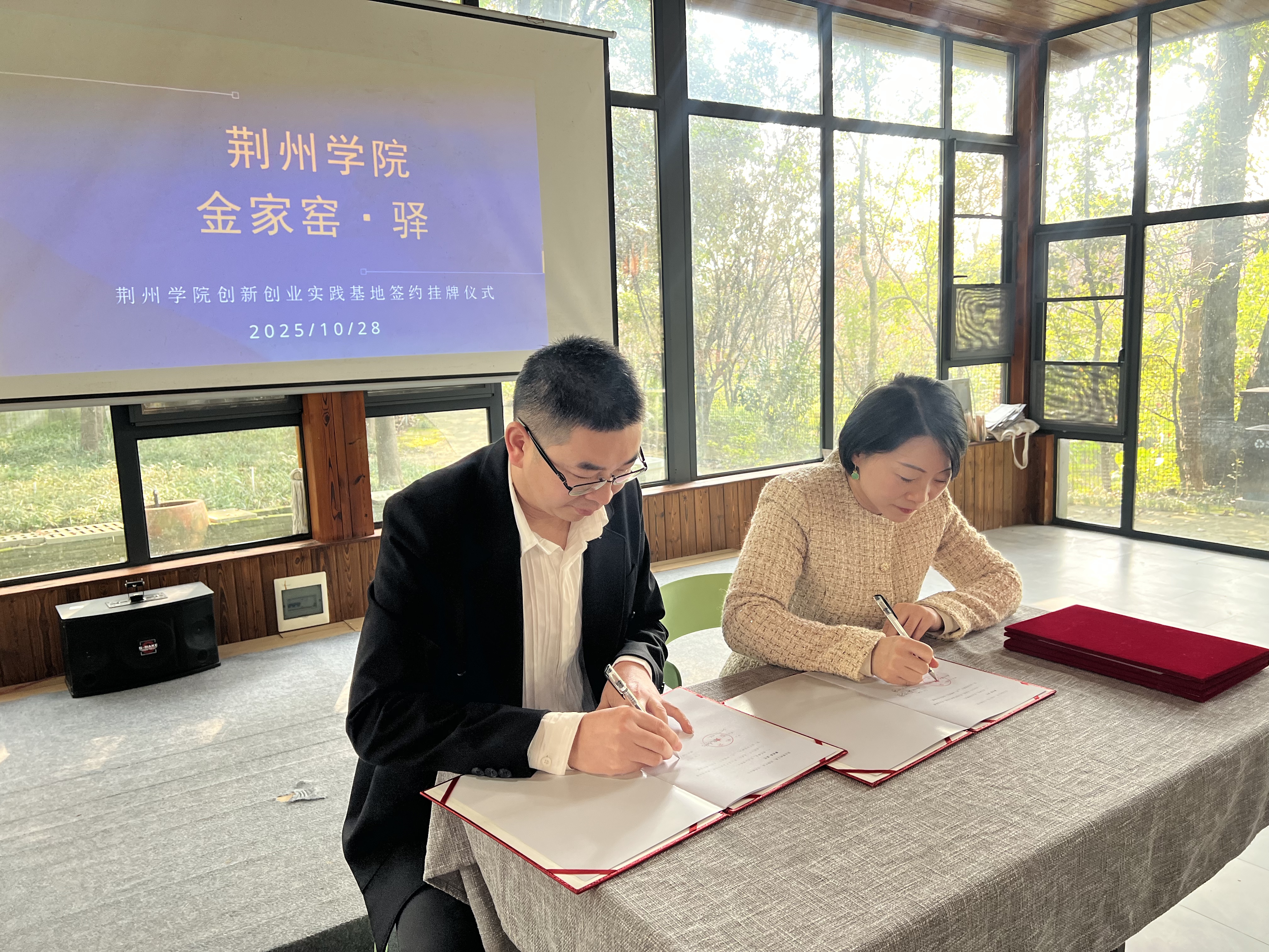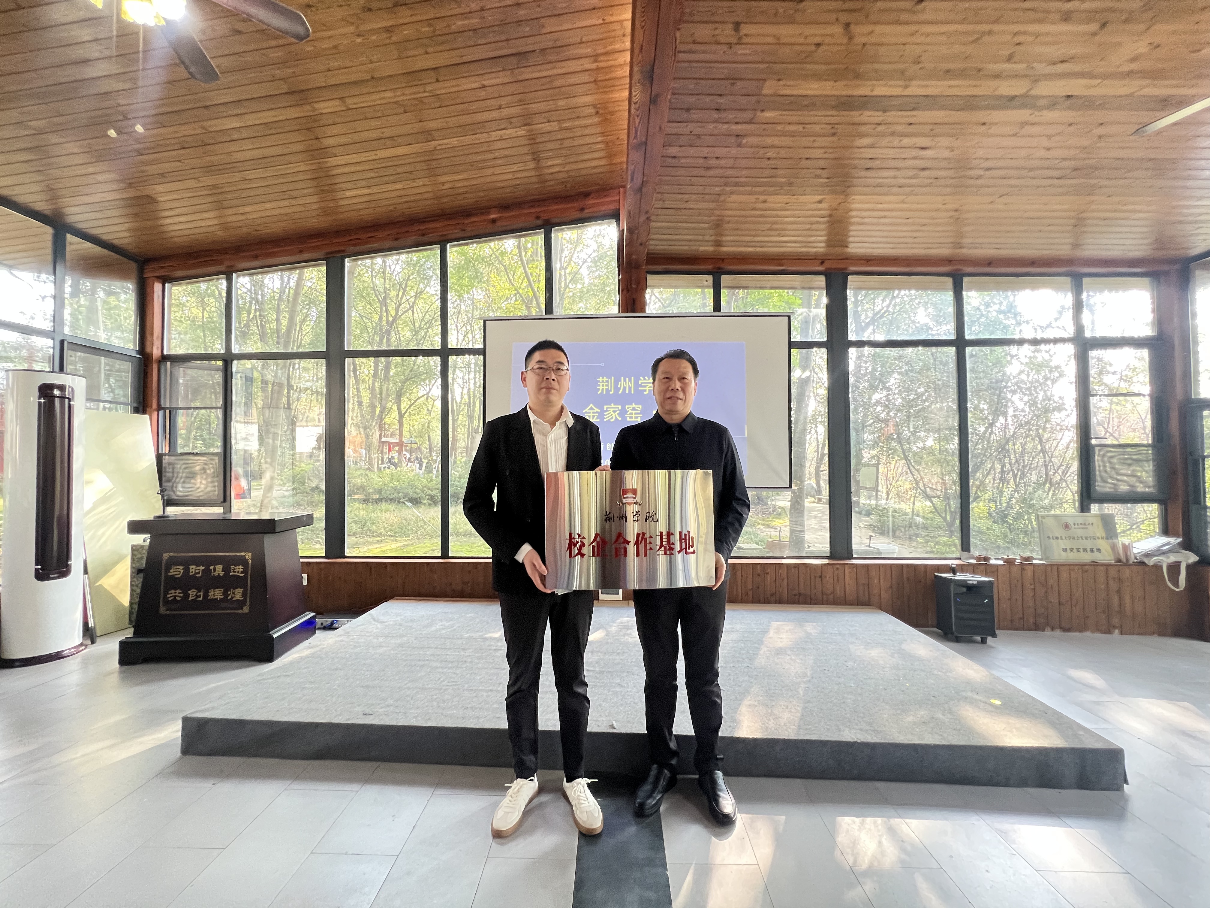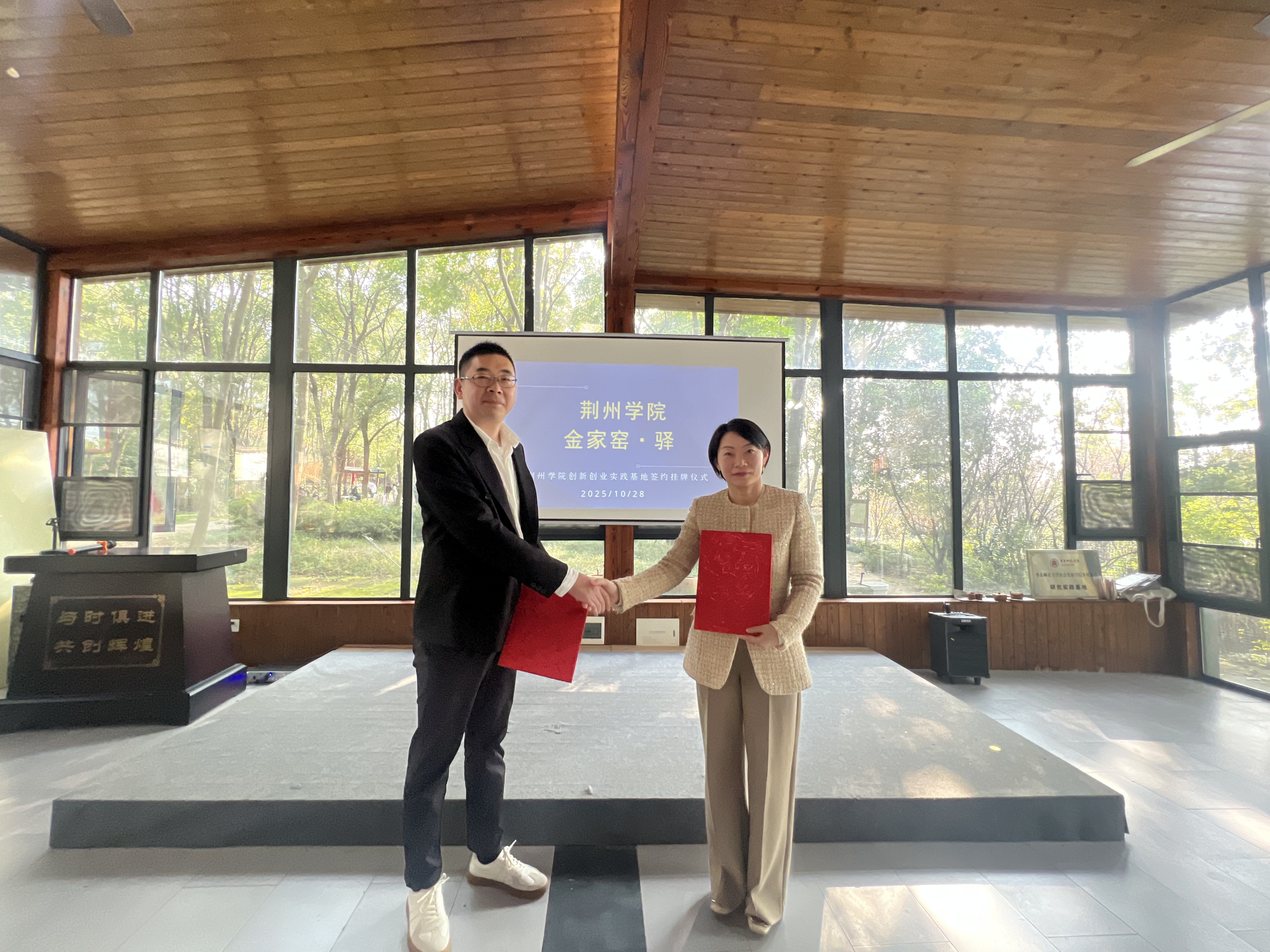 活动的重要环节 —— 授牌仪式随之举行。荆州学院与金家窑驿正式签署合作协议,戴国强校长代表学校向金家窑驿授予 “荆州学院实习实训基地” 与 “荆州学院创新创业实践基地” 牌匾,金家窑驿基地负责人郑重接牌。两块牌匾的授予,标志着双方在学生实习实训、创新创业培养方面的合作正式落地,为荆州学院学生提供了接触非遗文化、参与实践创新的优质平台,也为金家窑驿非遗文化的传承与发展注入了高校智力资源。