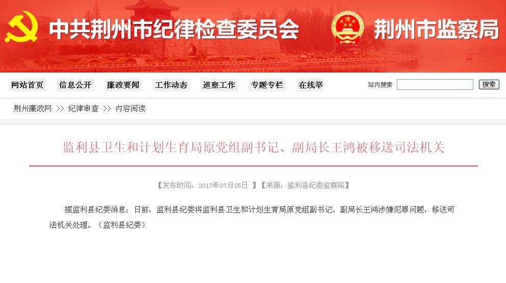 监利县卫计局原党组副书记、副局长王鸿被移送司法机关
