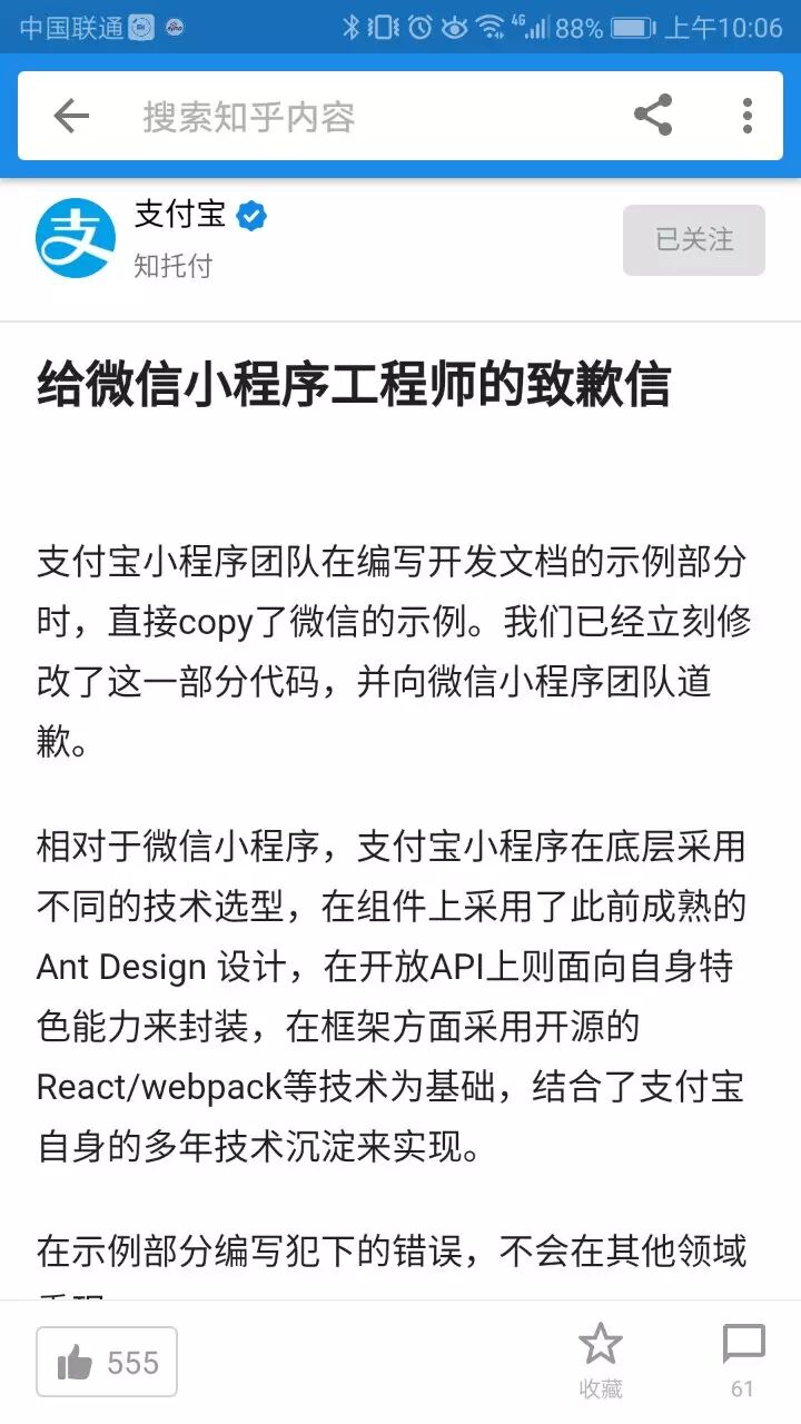 对此,支付宝知乎官方账号在当天晚间正式发布道歉信,承认错误。支付宝小程序团队承认,在编写开发文档的示例部分时,直接copy了微信的示例。目前该团队已经立刻修改了这一部分代码,并向微信小程序团队道歉。