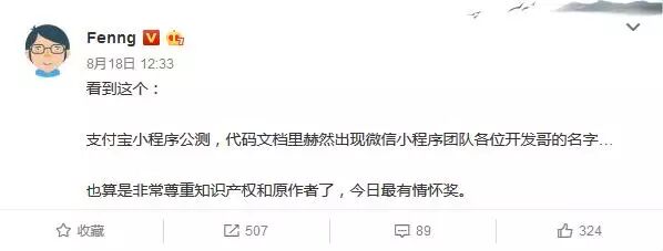 8月18日,支付宝小程序正式露出水面。当天中午,科技号大V冯大辉在微博上爆料,支付宝小程序代码文档里赫然出现微信小程序团队各位开发者的名字。