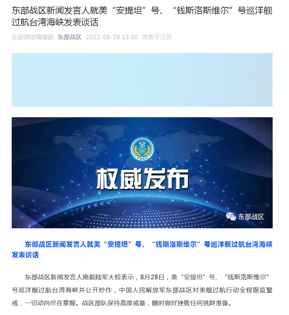据东部战区微信公众号消息,东部战区新闻发言人施毅陆军大校表示,8月28日,美“安提坦”号、“钱斯洛斯维尔”号巡洋舰过航台湾海峡并公开炒作,中国人民解放军东部战区对美舰过航行动全程跟监警戒,一切动向尽在掌握。战区部队保持高度戒备,随时做好挫败任何挑衅准备。