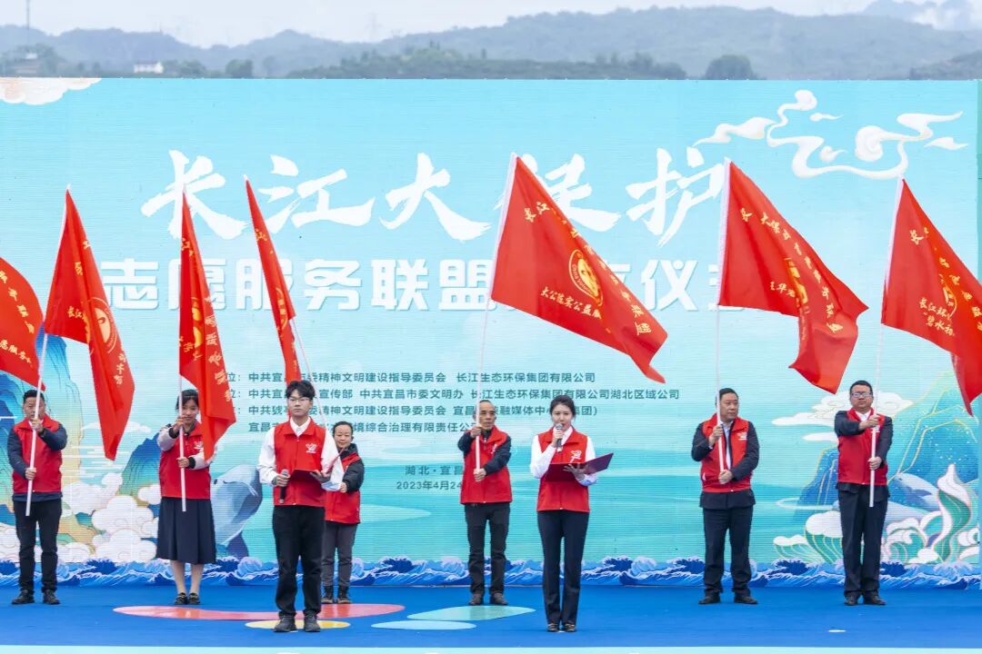 “守护长江,我辈荣光!让我们行动起来,积极参加长江大保护志愿服务活动,为呵护一江碧水永续东流贡献志愿力量!”当天,联盟为长江环保集团“守护碧水”志愿服务队、华中农业大学“本禹”志愿服务队、宜昌“三峡蚁工”生态环保志愿者协会等18支代表队授旗,长江环保集团湖北区域公司志愿者陈静凌、三峡职院大学生志愿者邓志轩宣读了《长江大保护志愿服务倡议书》,共同发出争做长江大保护的宣传者、践行者、捍卫者的时代强音。
