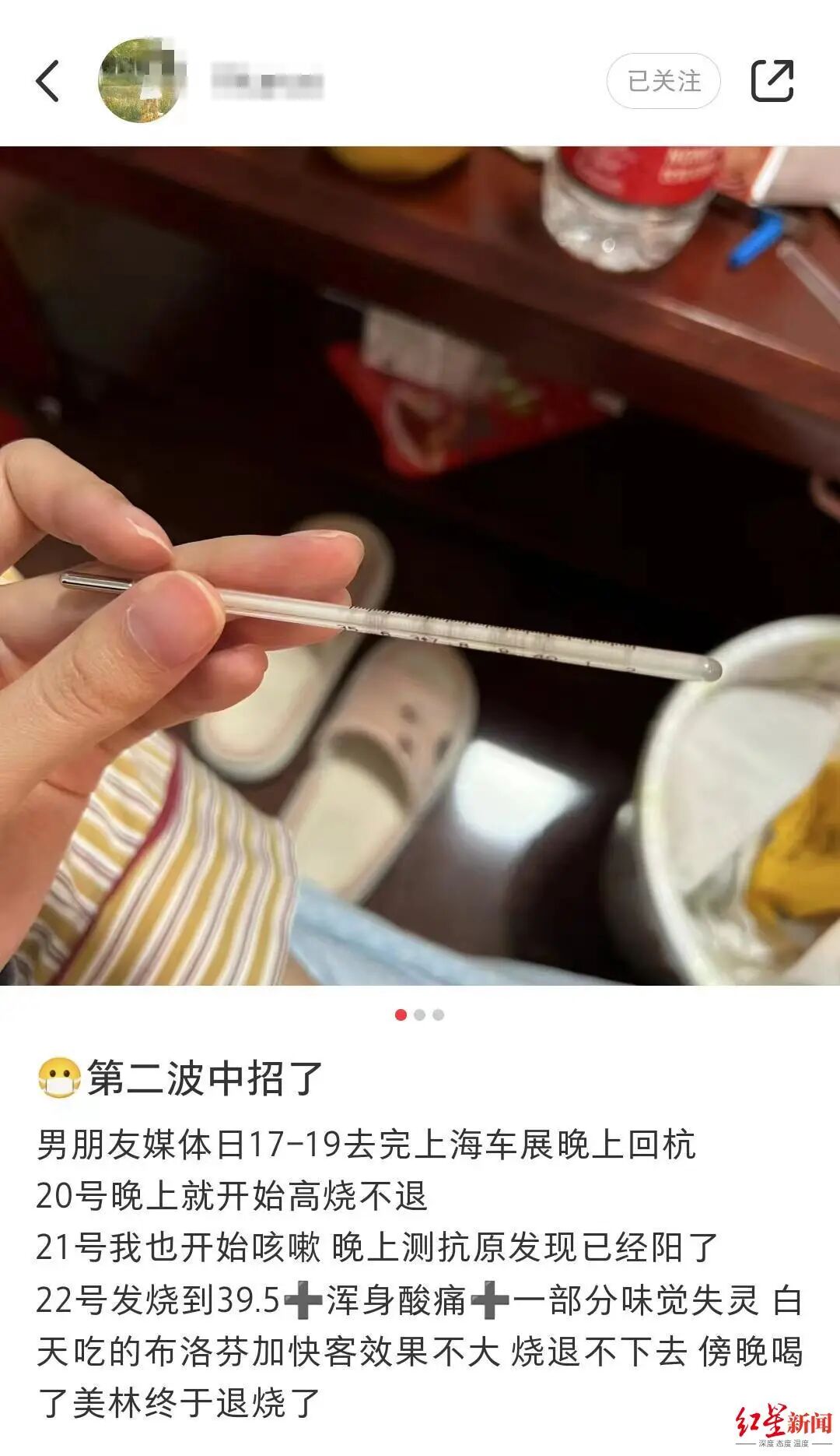 还有一位浙江杭州的女网友称,男朋友在4月17日至19日参加完上海车展活动后感染,4月20日高烧不退。4月21日,她也被传染了,出现咳嗽症状,当晚抗原检测呈阳性。这位女网友告诉红星新闻,她和自己的男朋友都是首次感染。