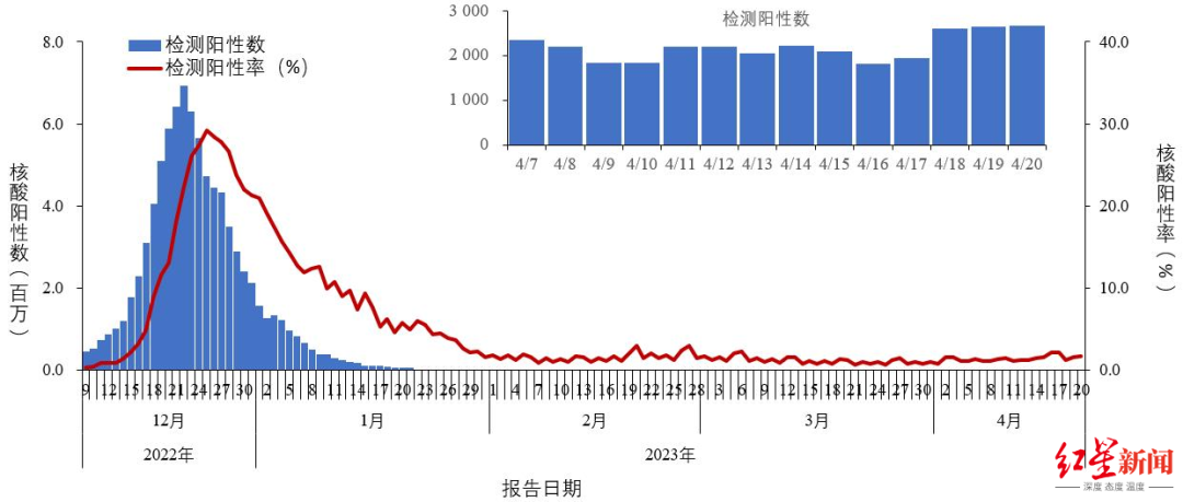 4月22日,中国疾病预防控制中心发布《全国新型冠状病毒感染疫情情况》,2022年12月9日以来,各省份报告人群新冠病毒核酸检测阳性数及阳性率呈现先增加后降低趋势,阳性人数12月22日达到高峰(694万)后波动下降,2023年4月20日降至2661例;检测阳性率2022年12月25日达高峰(29.2%)后波动下降,2023年4月20日为1.7%。