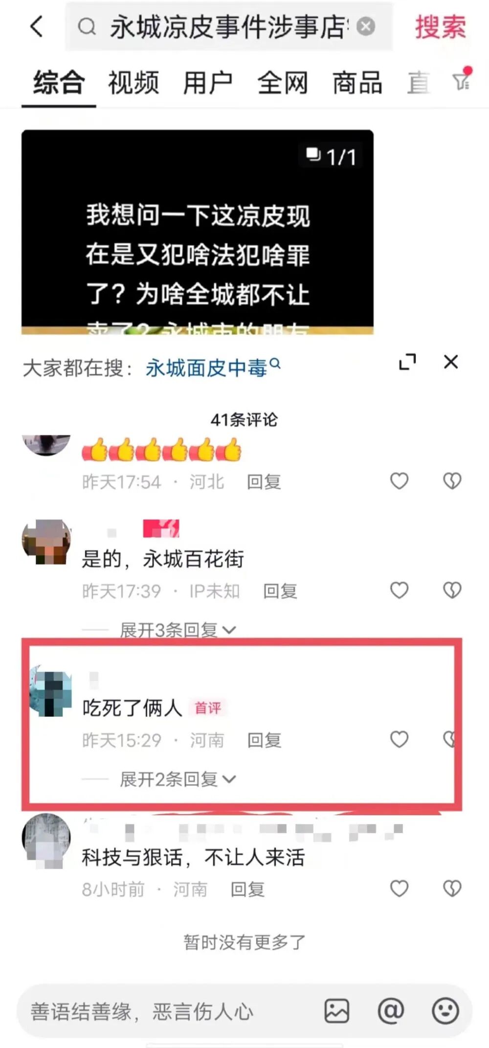 近日,网上出现多则内容为河南永城市两名女子吃凉皮后中毒致1死1伤的消息。