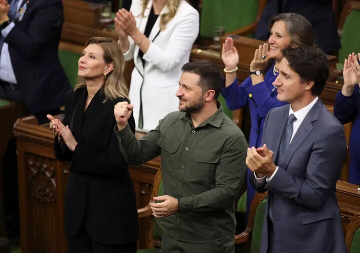 美联社此前发布的照片显示,乌克兰总统泽连斯基9月22日在加拿大议会发表讲话时,观众鼓掌欢迎一名98岁的乌克兰民族主义者,此人在二战期间曾在乌克兰第一师服役,该师也称作党卫军“加利西亚”师。其中一张照片的说明是:“乌克兰总统泽连斯基和加拿大总理特鲁多向二战期间在乌克兰第一师服役、后来移民加拿大的雅罗斯拉夫·洪卡致意。”(如下图)