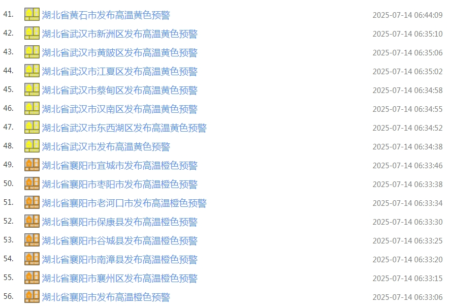湖北连发56条高温预警