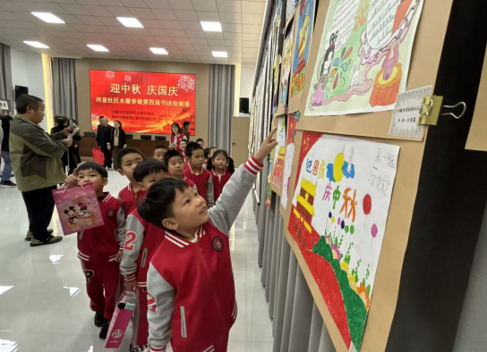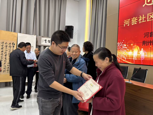 活动开始,社区和物业负责人致辞,并为参展者颁奖和献礼,感谢书画爱好者、楚绣传承人及小朋友们的积极参与,希望本次书画展能引发更多人对书画艺术的关注和热爱;自由观展环节,居民们纷纷移步至精心布置的展区,近距离欣赏悬挂展出的优秀作品,大家或驻足细品,或低声交流,遇到心仪作品的作者时,更是热情攀谈,分享感悟,探讨创作心得。现场氛围温馨而热烈,艺术的种子在交流中悄然播撒。