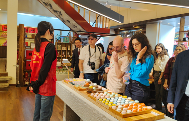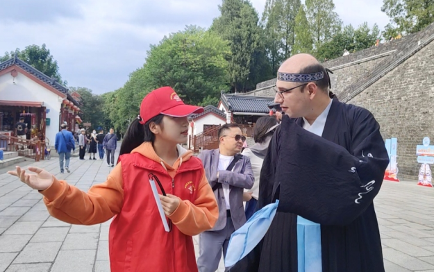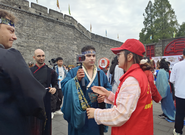 筹备阶段,“荆声有你”荆州区文旅志愿服务项目精心调配两批志愿服务团队协同发力。首批 20 名内场志愿者连续三天高强度作战,日均服务时长超 12 小时,从开幕式排练到会场布置,从开幕迎宾到嘉宾引导,他们以卓越的执行力和“奉献、友爱、互助、进步”的志愿精神,出色完成各项任务。第二批 16 名多语种讲解志愿者由教师、大学生等组成,专注服务国际嘉宾,提供宾阳楼导览、楚服换装体验等沉浸式文化服务,凭借多语言能力和文化亲和力,赢得国际友人广泛赞誉。宾阳楼下,身着汉服的外宾现场学习中文,真诚感谢志愿者的热情服务。