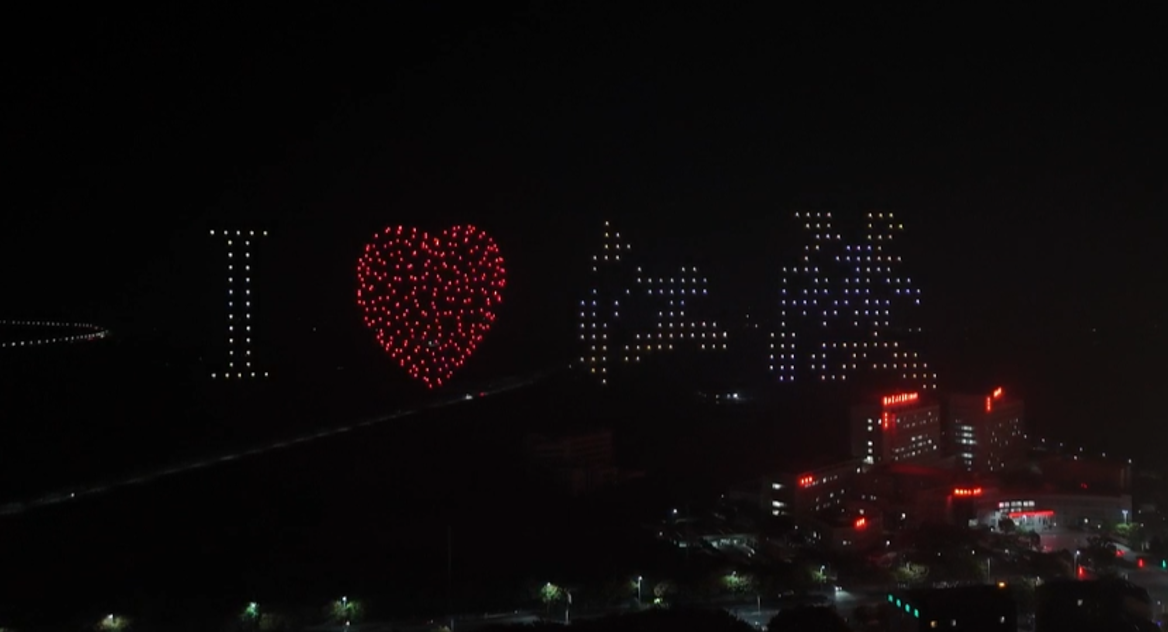 当主持人的倒计时响起,市民们纷纷将目光聚焦上空—500 架无人机携着光影翩然升空,以夜幕为卷、流光为笔,在天际间翩然起舞。它们时而整齐排列成 “祝福祖国”“我爱江陵” 的深情告白,时而活灵活现地勾勒出江陵地标的剪影与特色图案,每一帧变幻都引来现场如潮的惊叹与欢呼。市民们纷纷举起手机,将这科技与艺术交融的瞬间,定格为难忘的记忆。