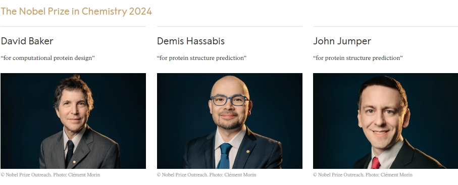2024年诺贝尔化学奖得主。图片来源:诺贝尔奖官网截图2024年的诺贝尔化学奖授予美国华盛顿大学西雅图分校的戴维·贝克,以及谷歌旗下“深层思维”公司的德米斯·哈萨比斯和约翰·江珀,以表彰他们破解了蛋白质神奇结构的密码。