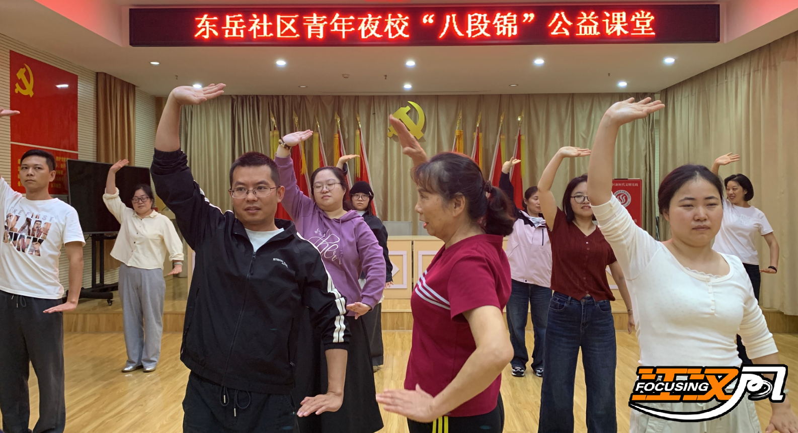 江汉风报道:近日,沙市区东岳社区联合荆州市融媒体中心,以青年夜校为载体,推出“八段锦”公益课堂。课堂上,二十余名青年跟着老师的口令舒展肢体,用传统养生功法点亮夜晚健康活力。