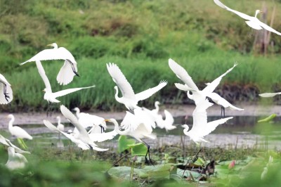 如今,随着洪湖生态环境持续改善,保护区内目前已发现鸟类173种,2024年度全省水鸟同步调查监测到越冬水鸟44种、超70000只,同比增加45.43%,新增白鹤、东方白鹳、青头潜鸭、白琵鹭等珍稀鸟类。