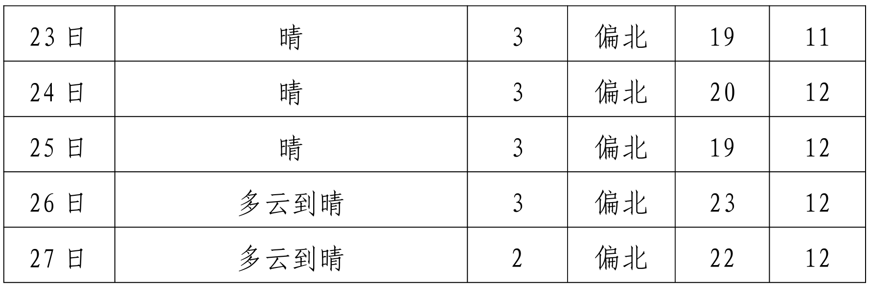 未来4~10天(10月21~27日):全市以多云到晴的天气为主。大部地区高温14~23℃,低温9~12℃。