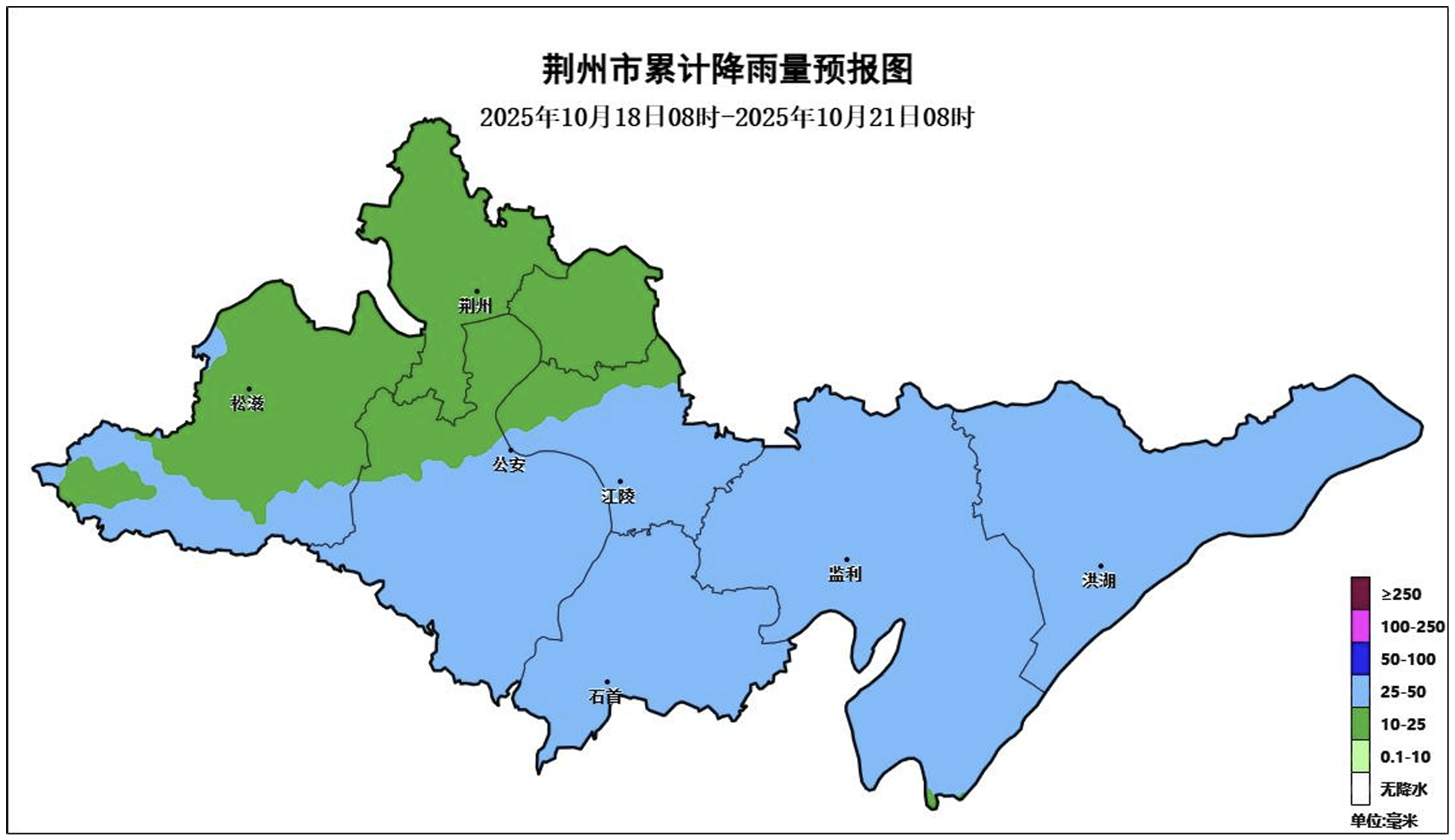 预计未来三天荆州市维持阴雨天气,大部累计雨量20~40 毫米。主要降水时段:18日。汉江2025年第7号洪水已形成,需加强东荆河秋汛防御工作。
