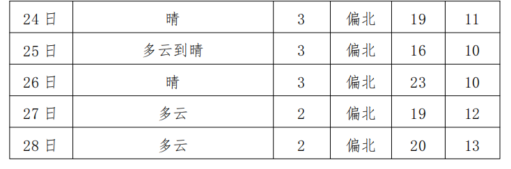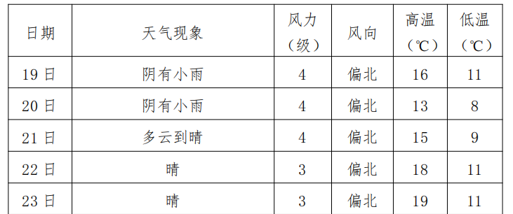 今明两天我市阴雨天气维持,大部阴有小雨;后天大部 转为多云到晴。受冷空气持续影响,有 3 到 4 级偏北风、阵 风 5 到 8 级,最低气温将降至 8~10℃。 未来 4~10 天(10 月 22~28 日):我市以多云到晴天气 为主。气温波动上升,大部高温 16~23℃,低温 10~13℃。