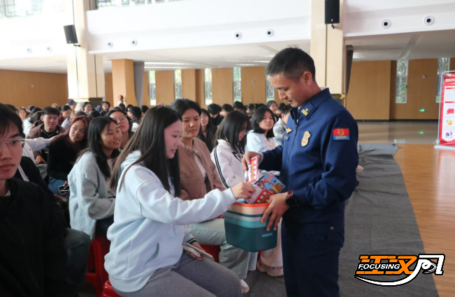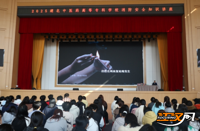 疏散演练后,消防安全知识讲座开讲。荆州区消防救援大队监督员以《2025年消防月主题宣传片》为引,结合学生宿舍用电、实验室操作等日常场景,深入讲解火灾成因、初期火情扑救等知识,“案例+场景”的讲解方式让安全理念深入人心。
