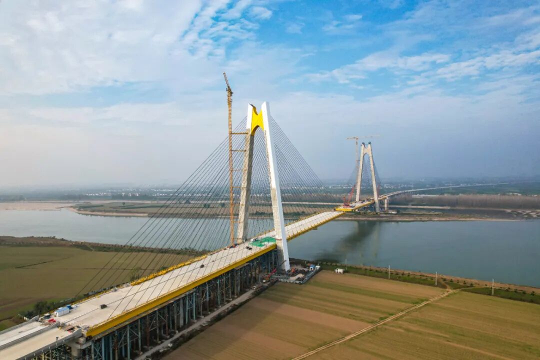 在松滋河特大桥施工现场,工人们正在对桥梁进行涂装作业以及边跨支架拆除施工。目前,当枝松高速松滋段主体工程已基本完工,力争2026年6月达到通车条件。