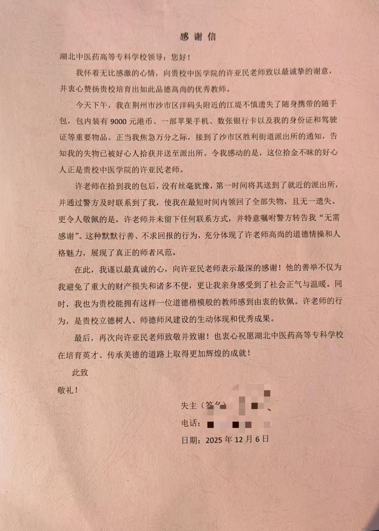 江汉风报道:12月11日中午,失主王先生带着感谢信和锦旗专程到湖北中医药高等专科学校中医学院,表达对许亚民老师的感谢。许亚民以实际行动践行中华传统美德,展现了教师立德树人的良好风貌,为校园增添了温暖正能量。