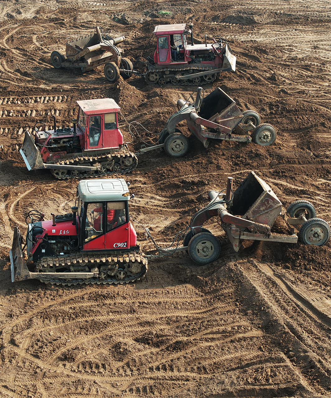 江陵县郝穴镇大兴村高标准农田建设项目现场,多台推土机和铲运机轰鸣着穿梭于田间,将高低错落的地块推平、压实。