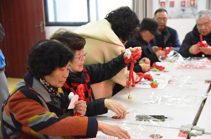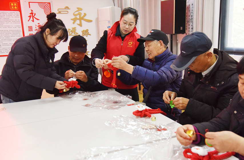 在大家的巧手下,一根根鲜红的绳线逐渐变成了寓意吉祥的中国结,喜庆又精致,寄托着大家对美好生活的憧憬。