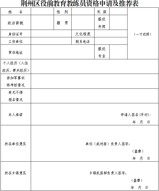 役前教育教练员不仅仅是单纯的军训教练员,而是每一名预定新兵接触的第一位、最紧密的军事工作人员,教练员必须符合征集新兵相关政治条件要求,恪守职业道德,具备正直、诚信的品质,严禁“兵油子”、征兵“掮客”混入其中。受过刑事处分人员、正在受司法机关立案侦查、纪检部门和监察机关立案审查的人员,不得报考。报名时本人提供《荆州区役前教育教练员资格申请及推荐表》《无犯罪记录证明》。