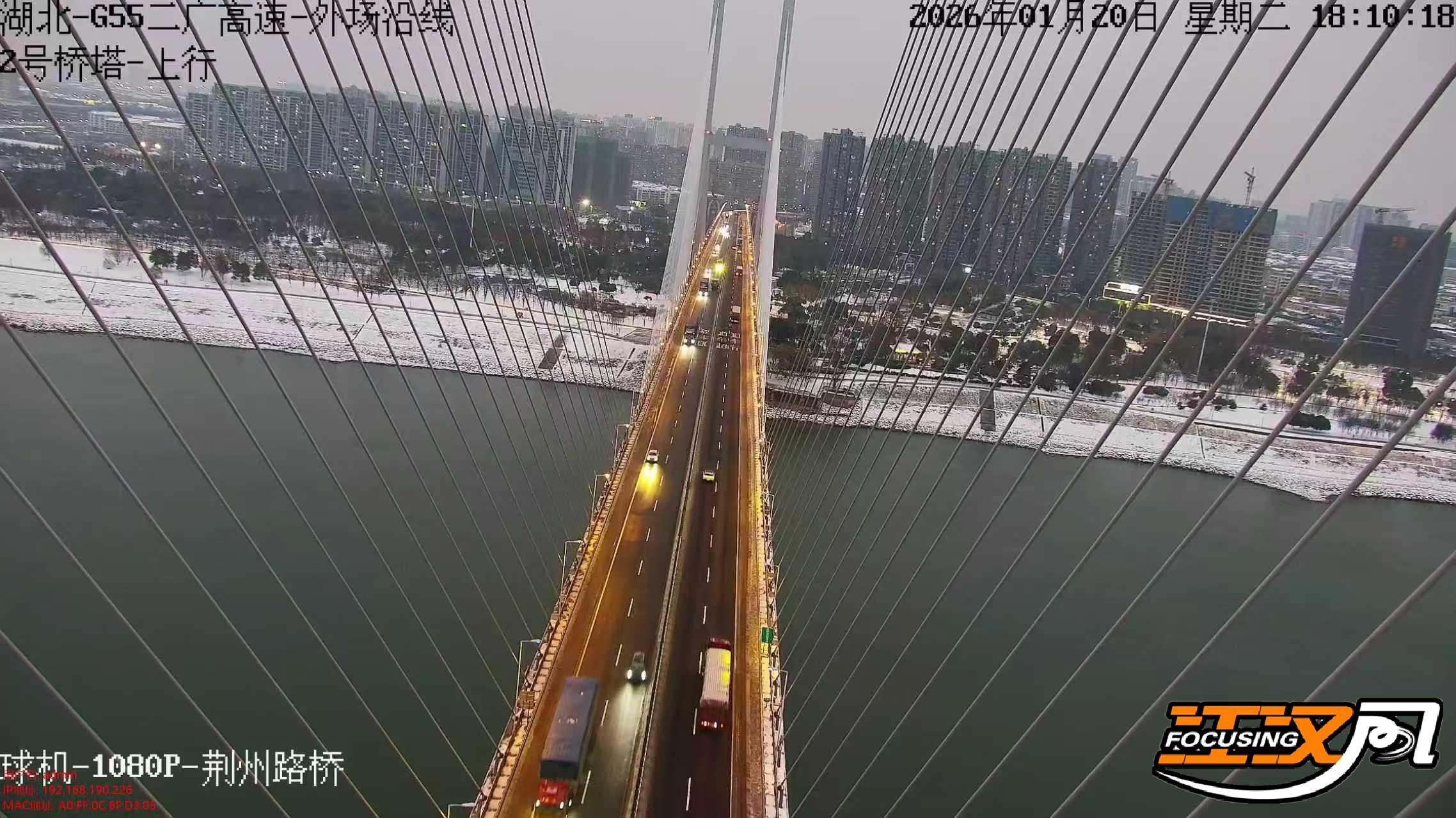 1月19日晚,荆州迎来降雪,荆州市路桥公司连夜出动吹雪车等除雪设备于荆州长江公路大桥路段开展作业。