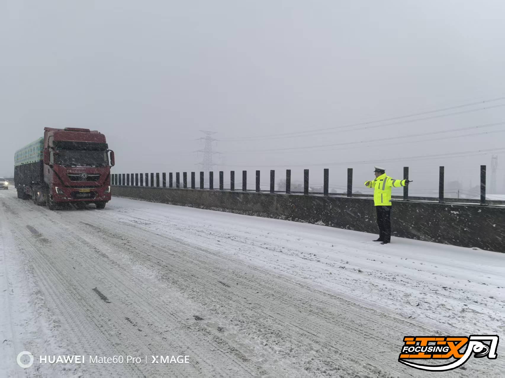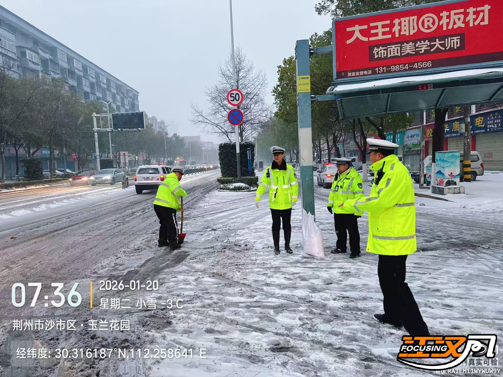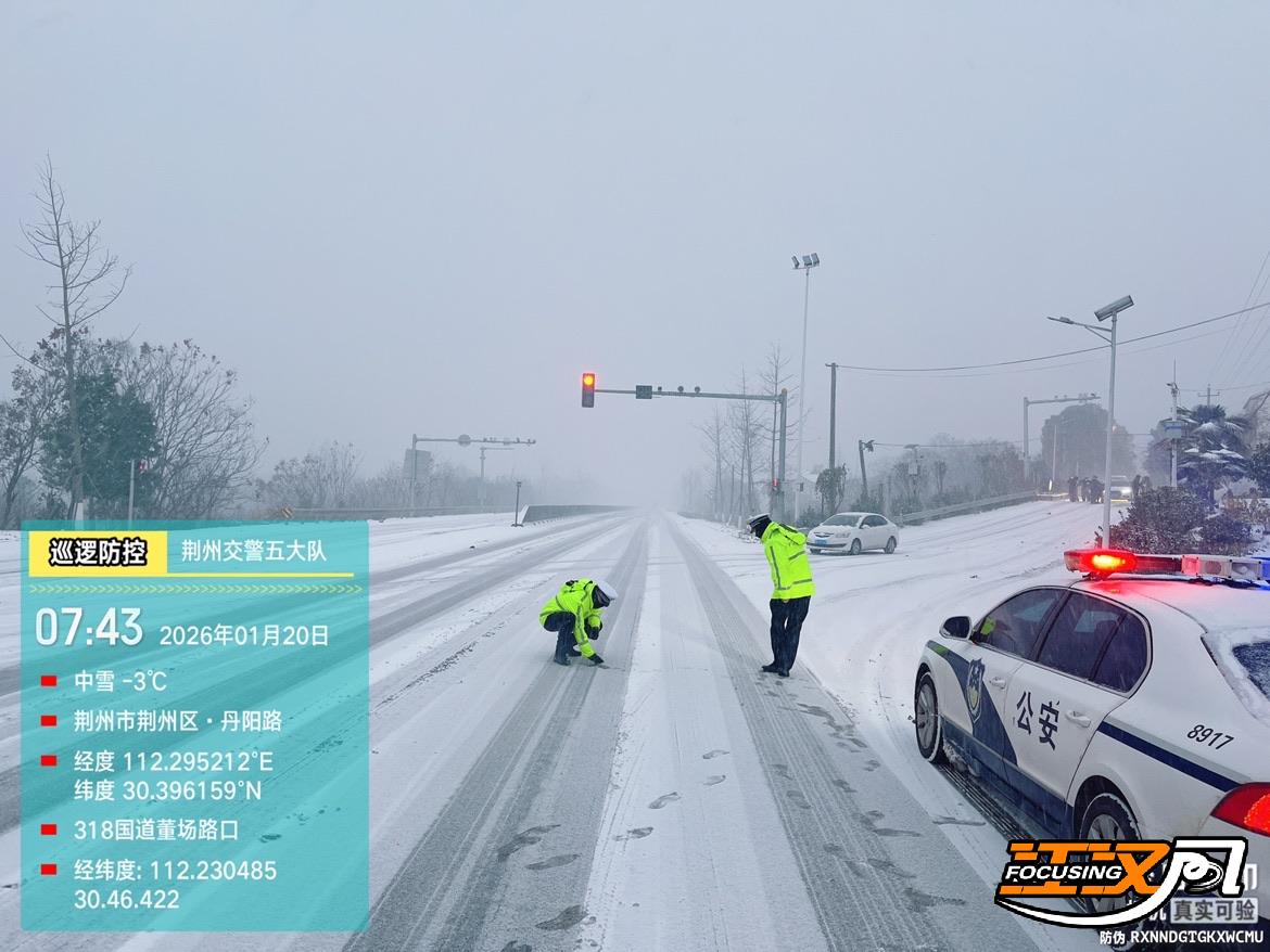 20日,荆州交警一大队各中队持续加强恶劣天气巡控监测,高峰点提前到岗到位协同公路养护部门铲雪除冰全力保畅。(记者:佘海燕)