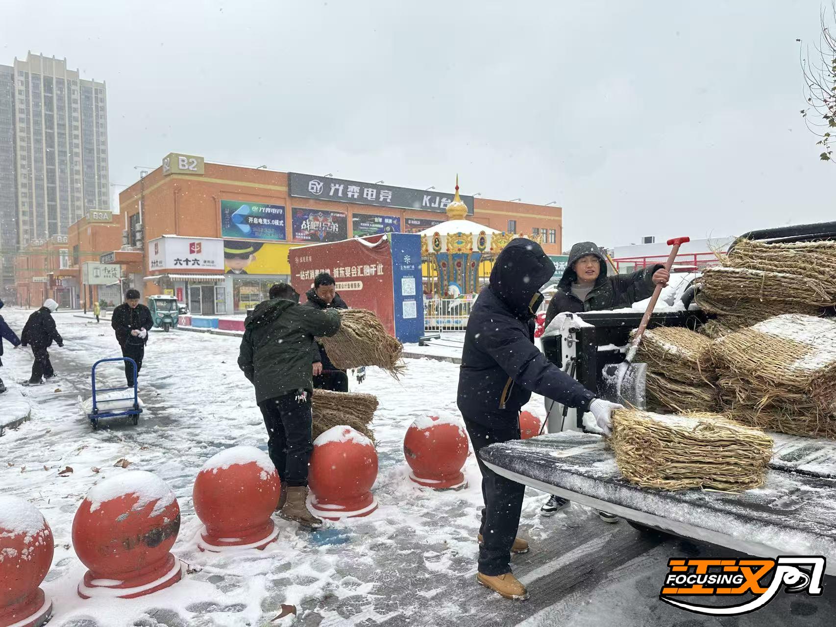 1 月 20 日上午,荆发控股集团组织工作人员,在泓光・悦邻广场及农贸市场铺设草垫、撒融雪剂,保障前来采购物的市民安全出行;同时在荆开广场、曙光路公寓开展融雪剂抛撒和草垫铺设作业,为辖区企业员工出行保驾护航。(记者:王大玲 通讯员赵曼妮)