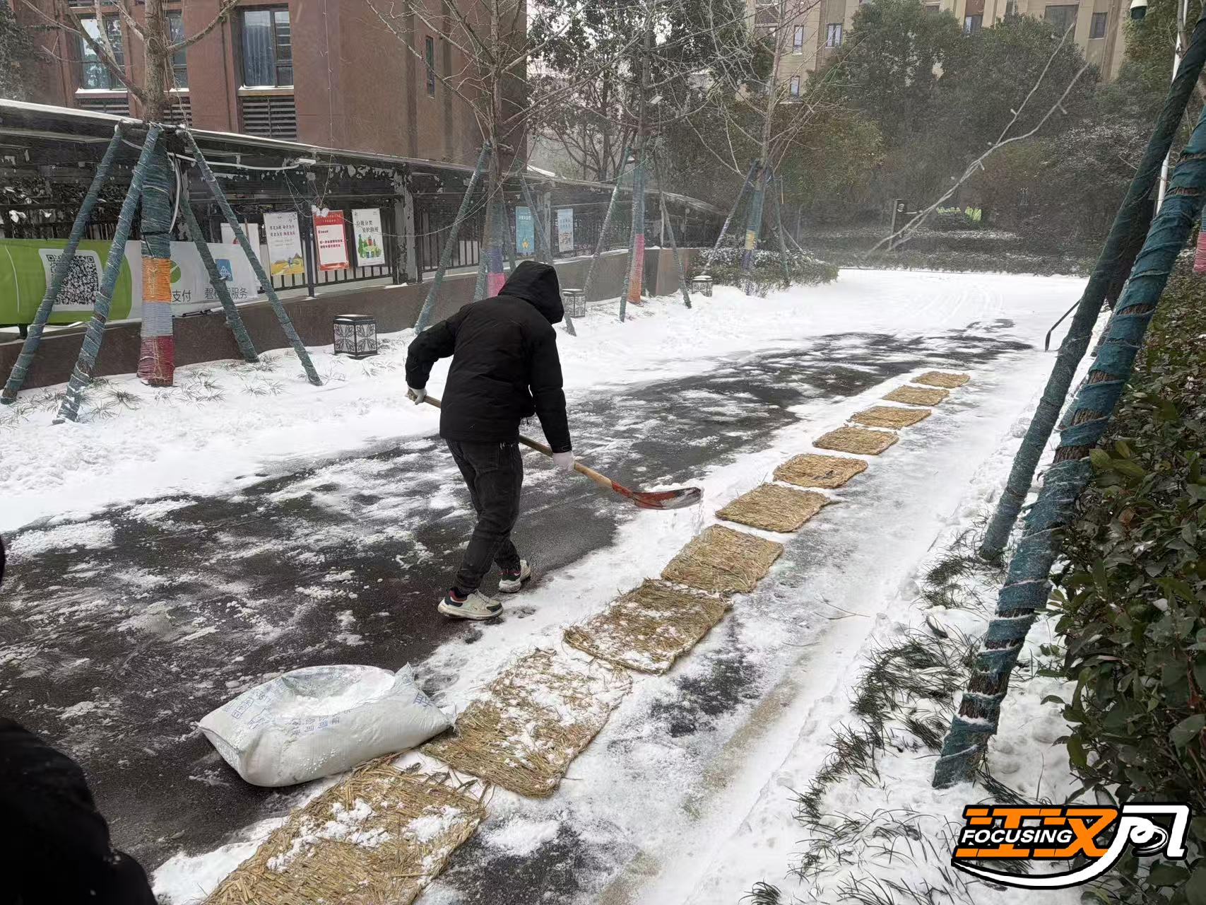 荆发控股集团针对重点区域精准施策,组织人员对美的配套产业园主道路进行铺洒融雪剂;对荆开广场、曙光公寓及地下停车场入口铺洒融雪剂,在广场二楼商铺平台、公寓入户大堂铺设防滑地毯;深入在建项目生活区开展安全巡查,消除雨雪天气带来的安全隐患。