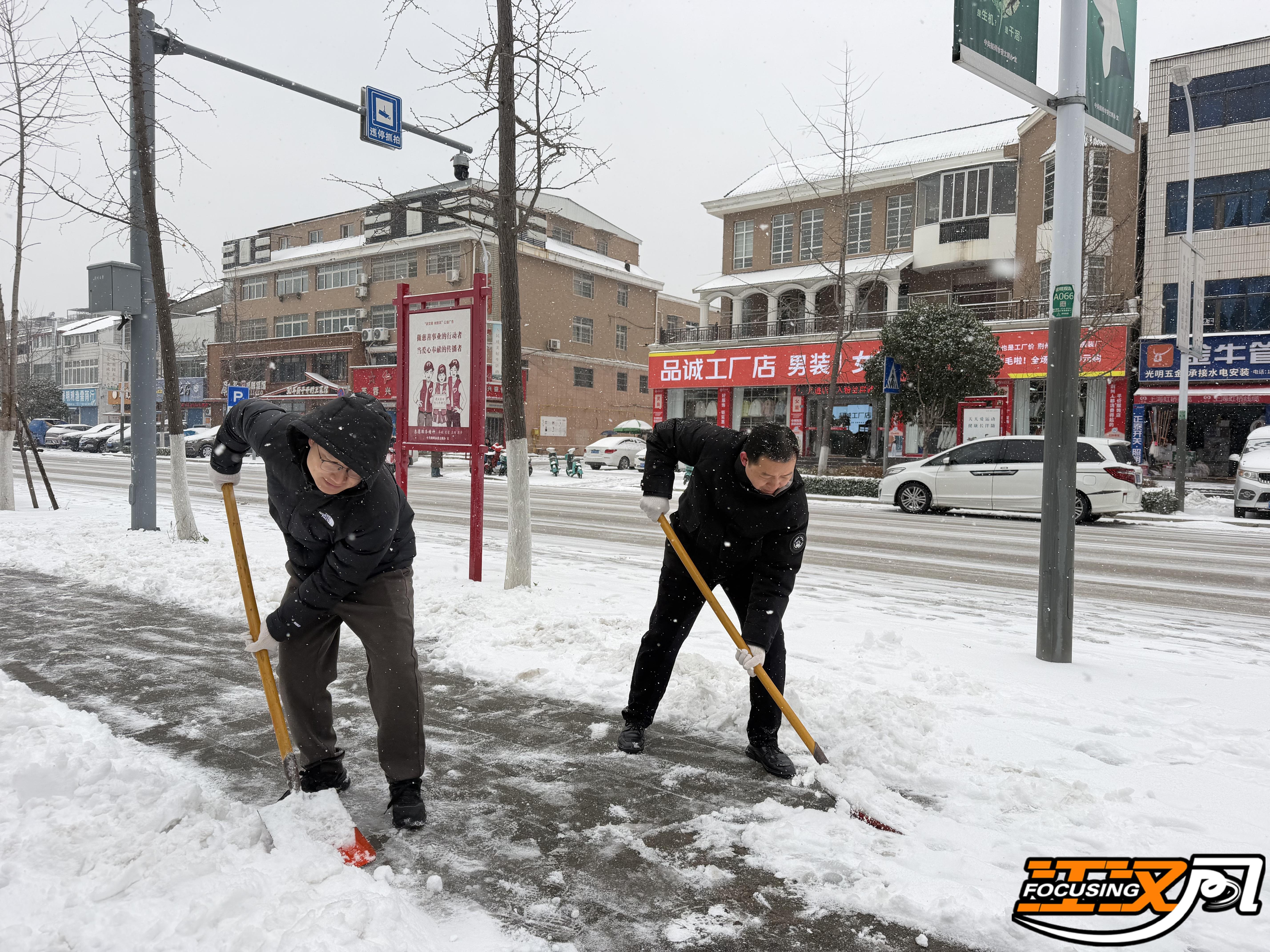 1月20日上午,沙市区解放街道武德路社区工作人员和志愿者,在辖区扫雪除冰,保障市民顺利出行。(记者:肖琦 通讯员:袁琴)