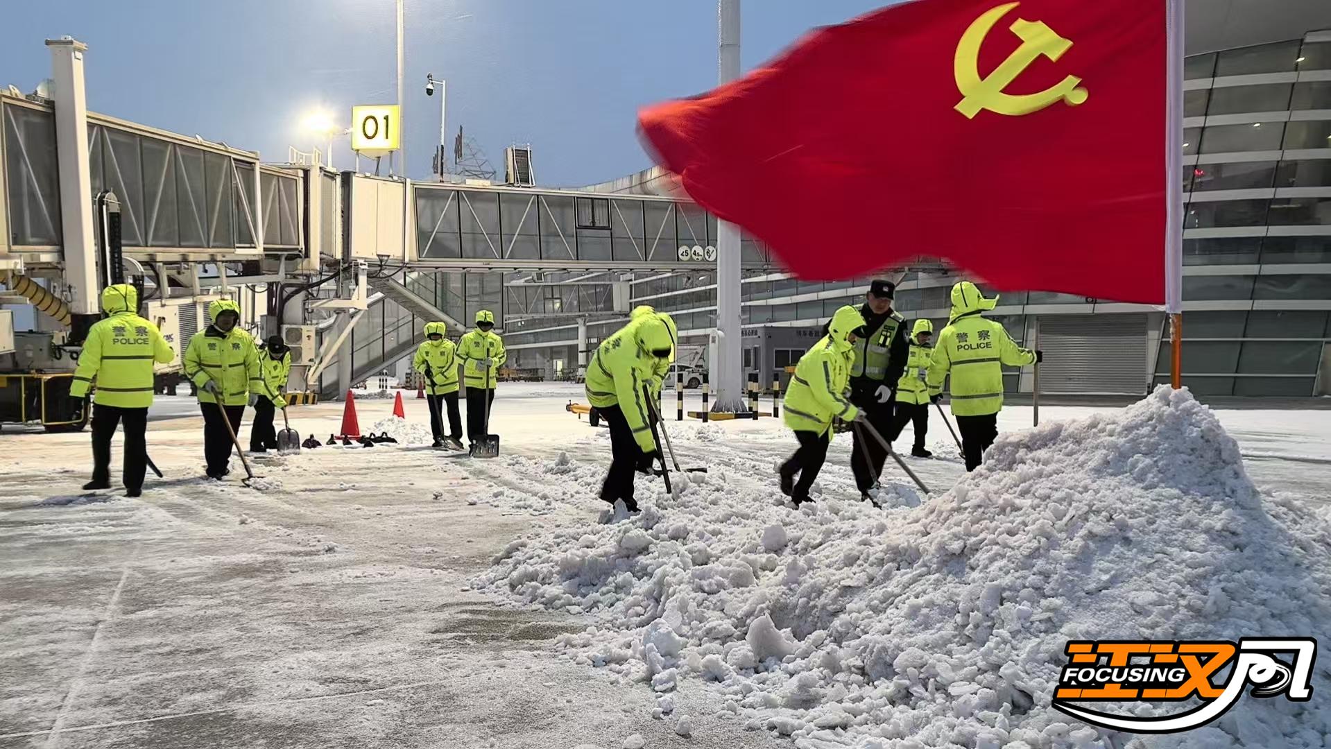 荆州沙市机场公安分局组织警力在停机坪开展扫雪除冰作业,保障航班运行安全畅通。(记者:张明金 通讯员:程佳)