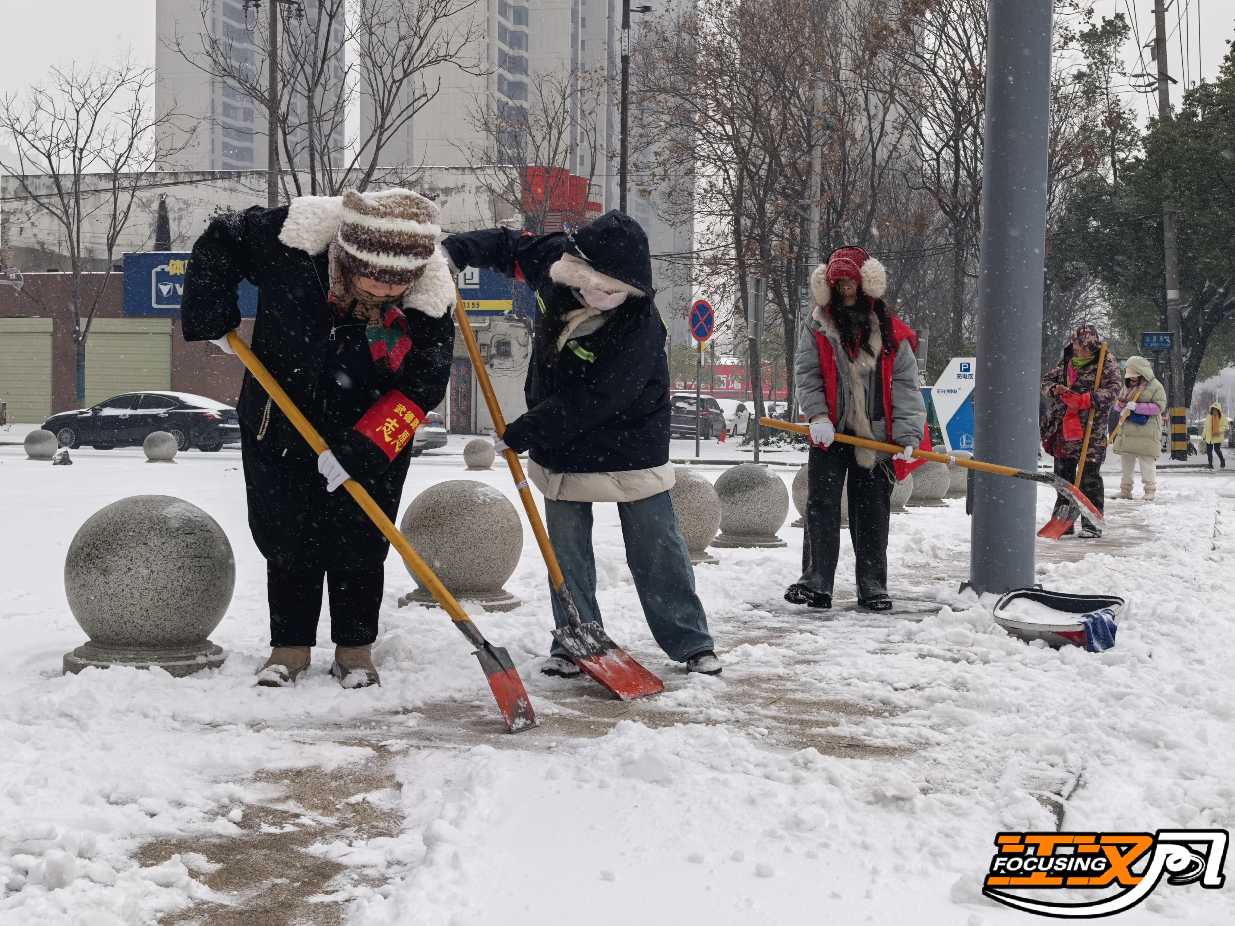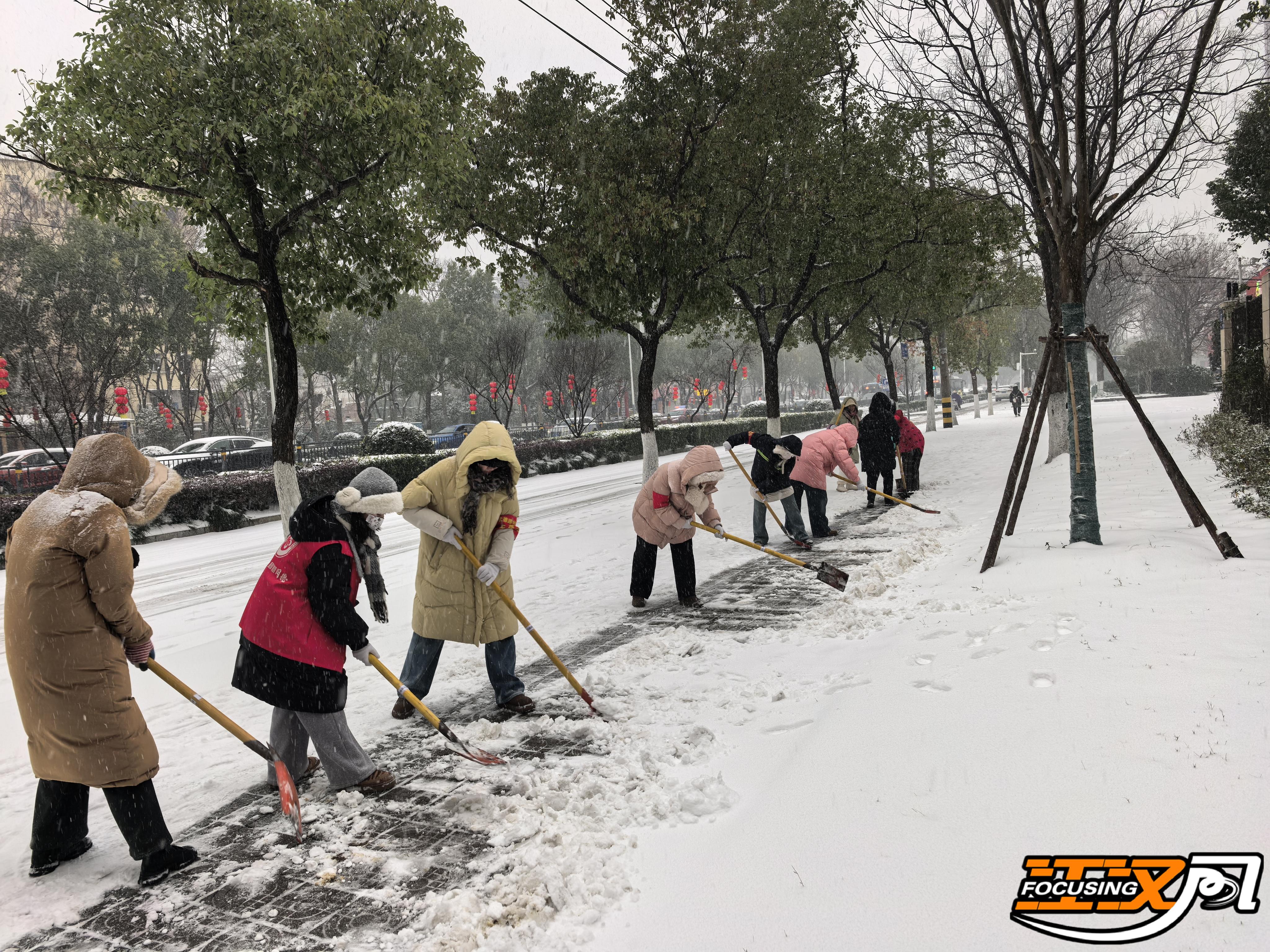 沙市区崇文街道凤台社区 社区工作人员、志愿者、辖区商铺居民、外卖小哥合力清除凤台主通道积雪让居民出行更加方便。(记者:陈明阳)