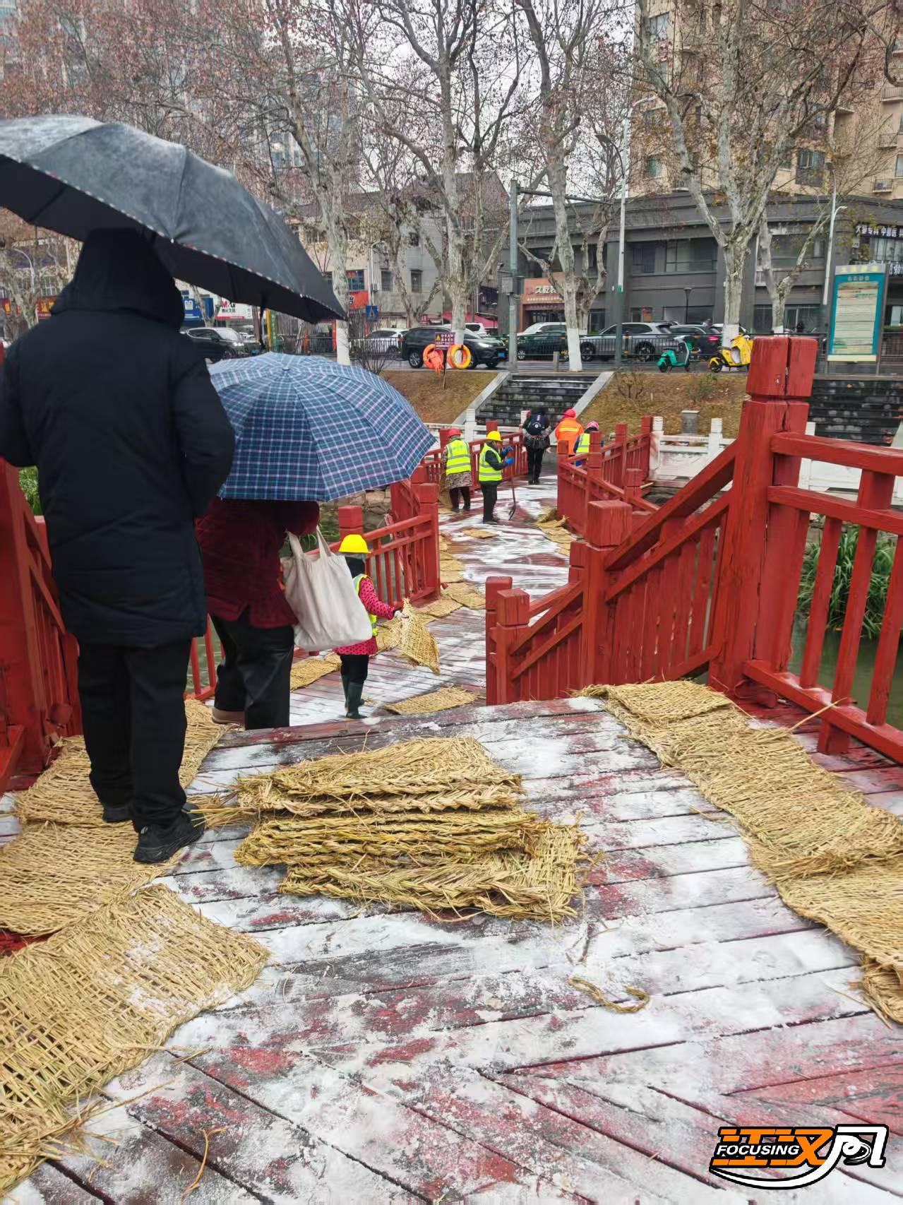 区综合执法中心组建应急专班进行道路巡查,同时组织工作人员及环卫工人,在干道桥梁播撒融雪盐;出动除雪车辆对东方大道、上海大道、荆沙大道等主干道进行积雪清扫;安排人员对游园步道、公厕台阶铺设防滑草垫。