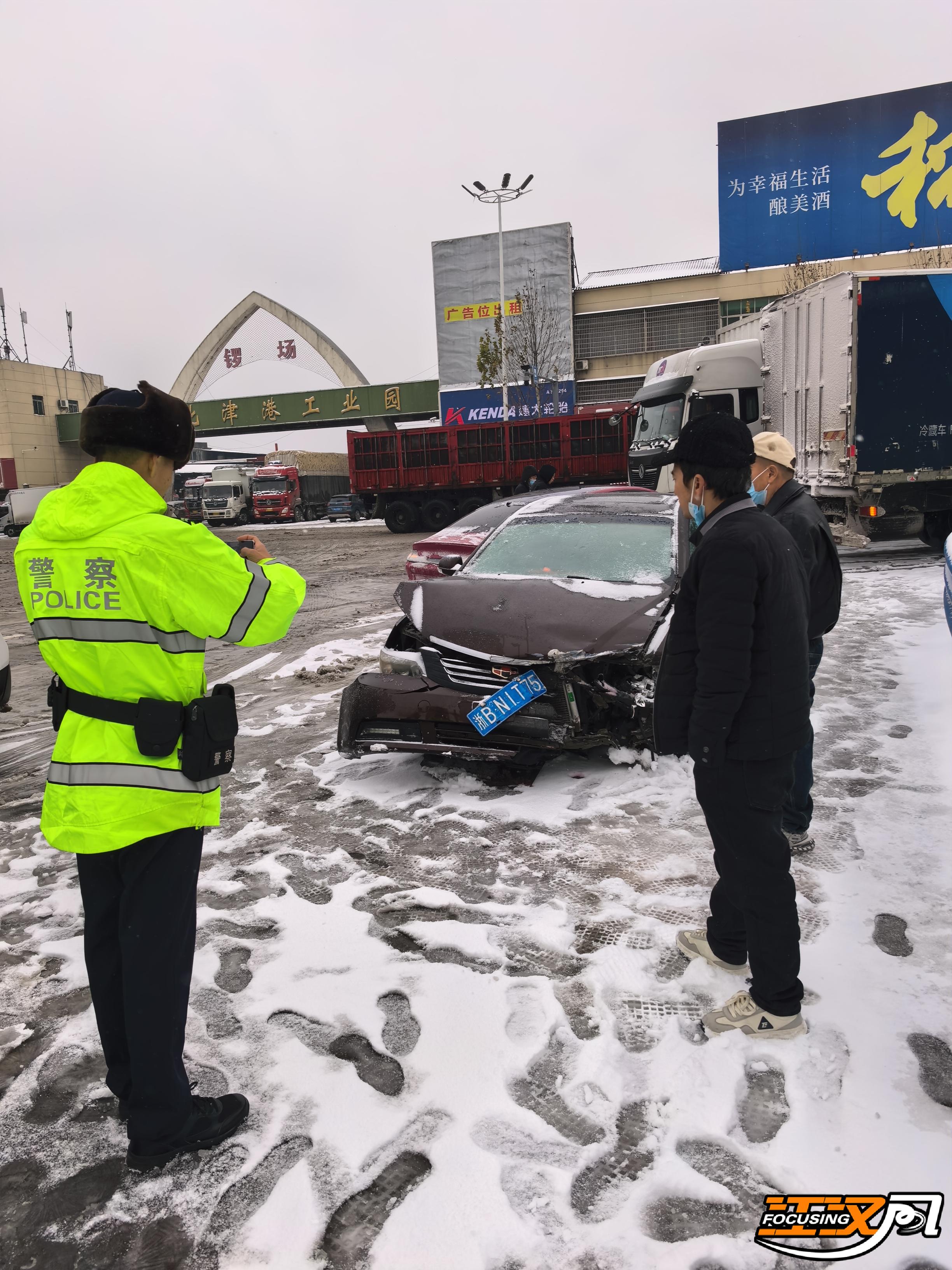 江津路公安局门口发生车辆碰撞事故,很快有交警现场疏导,此路段只短暂拥堵,雪天路滑,请广大市民朋友注意行车安全。