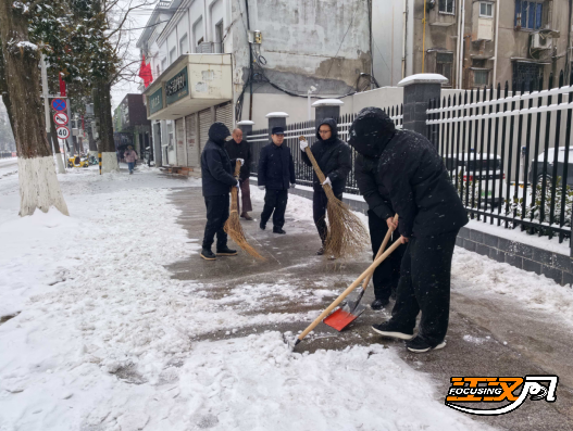 沙市区玉龙桥社区今早7:30 组织社区全体工作人员和志愿者共计11人,在西干渠至长港路的红门路上铲雪,同时发动商户的力量,让商户清扫门前积雪。(记者:董奥、吕靖怡)