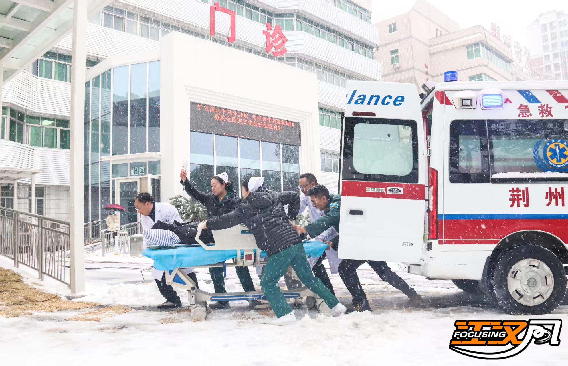 为保障市民健康及医疗救治安全,荆州市卫健委不等不靠,快速指导各医疗单位启动冰雪灾害应急预案。图为荆州二医医务人员正在通过绿色通道急救摔伤患者。(记者:张慜鋆、杨光)