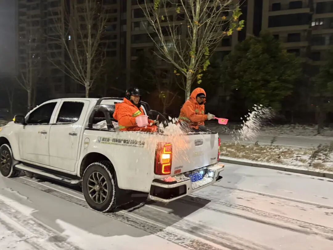 区城管执法局提前储备融雪剂220吨、各类除雪车辆30辆、除雪机械(扫盐车)11台、自卸车辆4台、快保车辆130台、防滑草垫3100个、铁锹310把、镐250把、麻袋200个。组织城管队员、环卫工人连夜开展铲冰除雪、路面巡查。