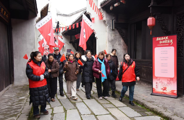 江汉风报道:近日,洪湖市瞿家湾湘鄂西革命根据地旧址热闹非凡,一群身着红马甲的“娘子军”格外引人注目,她们是瞿家湾村文旅志愿者队伍,在村妇女主任陈玲的带领下,成为景区一道亮丽的风景线。