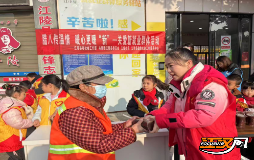 在腊八节到来之际,在江陵县新就业群体服务驿站前,孩子们在志愿者的带领下,亲手将热气腾腾的腊八粥递到环卫工人、快递员等新就业群体的手中。一句甜甜的“叔叔阿姨爷爷奶奶您辛苦了”,一个认真的鞠躬,让冬日的街头充满温情。这不仅是一次暖心的慰问,更是孩子们践行文明、传递关爱的生动课堂。