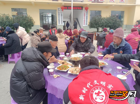 杨柳村新春团年宴开席,老年人围坐一桌,品尝着可口丰盛的菜肴,举杯同庆、笑语盈盈,村青年志愿服务队守在老年人身边照料用餐。