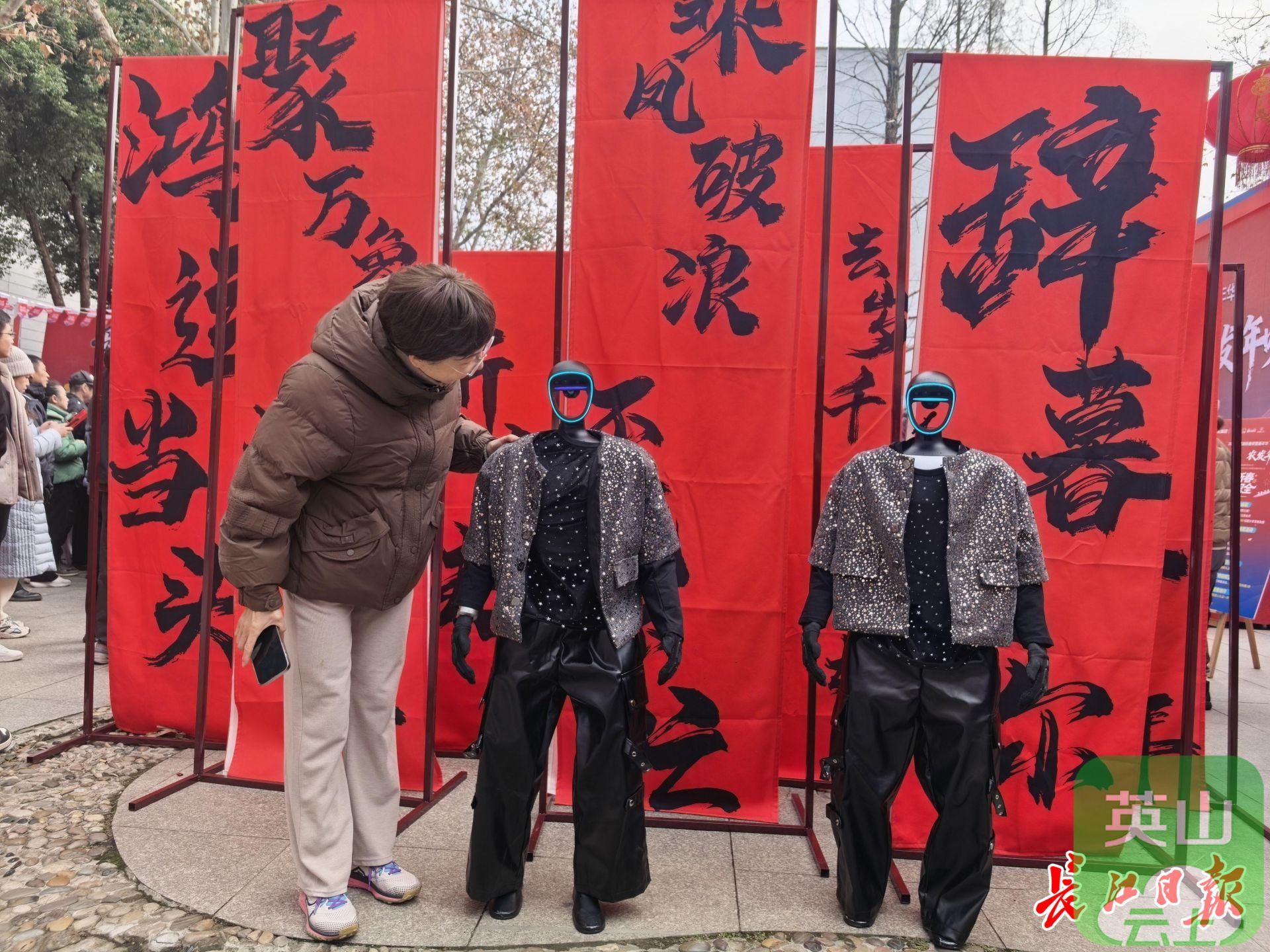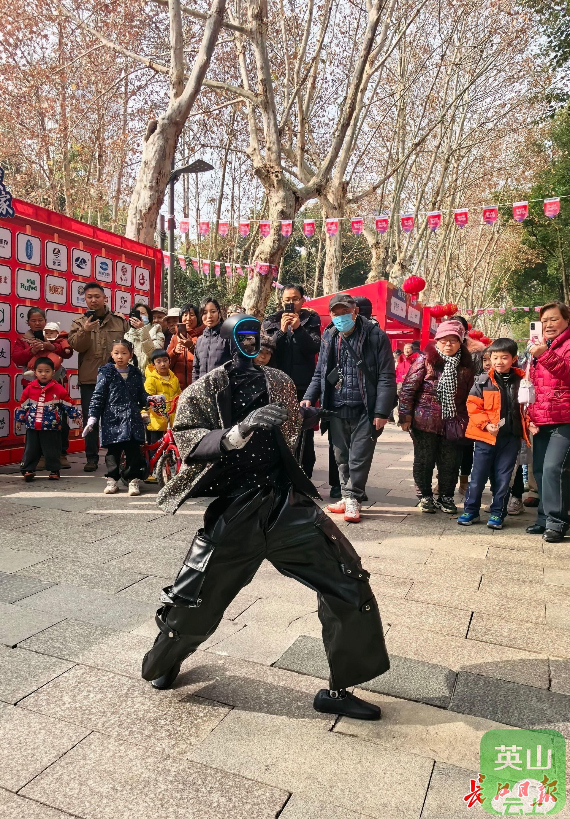 2月1日上午,2026年水果湖新春邻里嘉年华活动现场,2台机器人身着黑金配色的亮片流苏外套和黑色皮质阔腿裤,跳了一曲《火力全开》。灵活的身姿、精准的动作,赢得观众连连喝彩。