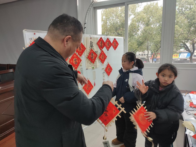 活动现场,黄有志结合楚简文化渊源,系统讲述“福”字的历史演变,指导孩子们遵循楚简书写规范,在斗方纸上认真书写“福”字,随后,黄老师聚焦竹编核心技艺,从竹片固定、间距把控到竹编手法,逐一细致讲解并亲自示范,耐心解答孩子们的疑问。为激发学习热情,活动设置经验分享环节,率先完成作品的学员走上前,分享竹编技巧与实操心得。活动制成的竹编作品编排成传统中国结的样式,两面粘贴斗方纸,兼具文化内涵与创意巧思,在讲解竹编技艺的同时,让非遗技艺传承与新春美好寓意深度融合。