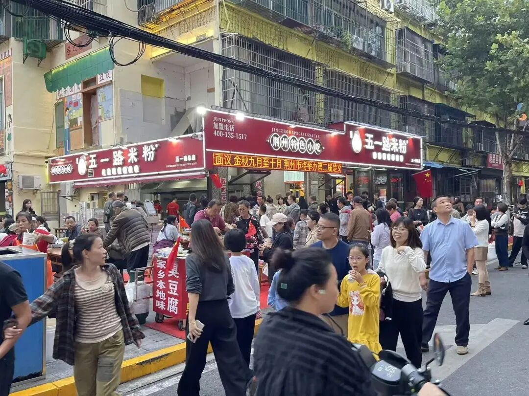 小胡鸭、麻辣烫、圆豆泡糯米、矮子馅饼、公安锅盔、砂锅米线等门店,随处可见排队的景象,场面热闹非凡。从巷头到巷尾,都是荆州人最熟悉的味道。