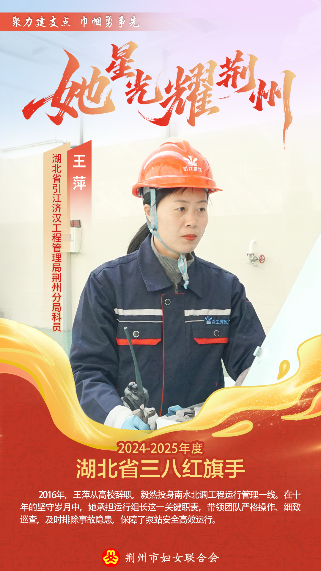 在引江济汉局连续五年抗御伏旱的调水工作中,王萍与同事们并肩作战。2024年8月起的跨年特大旱情期间,她在进口泵站坚守长达201天,带领团队严格操作、细致巡查,及时排除事故隐患,保障了泵站安全高效运行,为湖北省打赢四季连旱攻坚战作出了重要贡献。