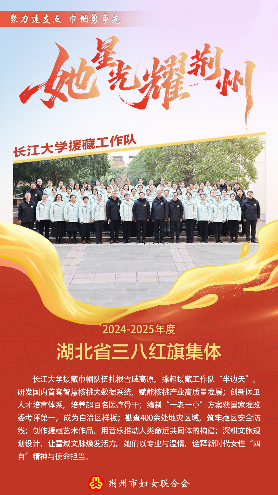 长江大学援藏工作队,荆州区西城街道三义街社区居民委员会“六邻服务”妇女小组,沙市区中山街道健康巷社区“578”志愿服务先锋队,江陵融媒巾帼电商助农团队,公安县守护河湖志愿者协会巾帼服务队荣获“湖北省三八红旗集体”称号。